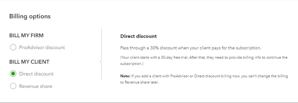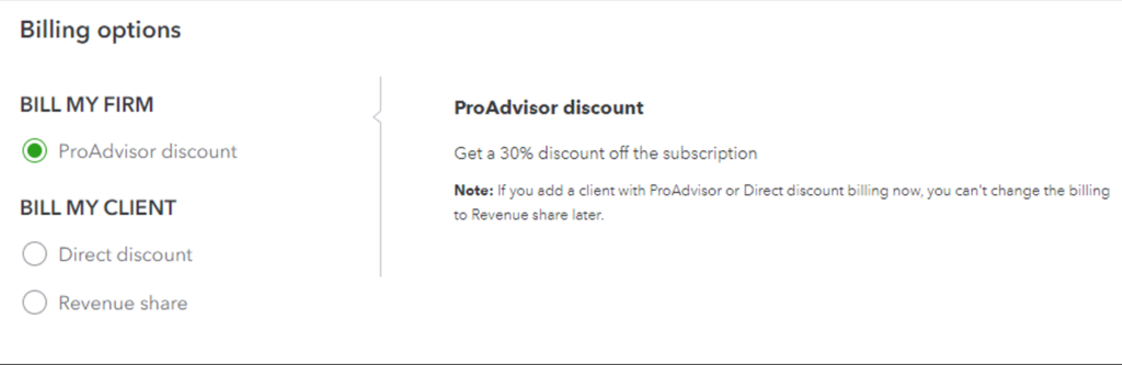 The billing options you can provide to your clients are all section of Pro Advisor Preferred Pricing program. This pricing program feature gives you and your clients exclusive discounts. How you charge your client is up to you.