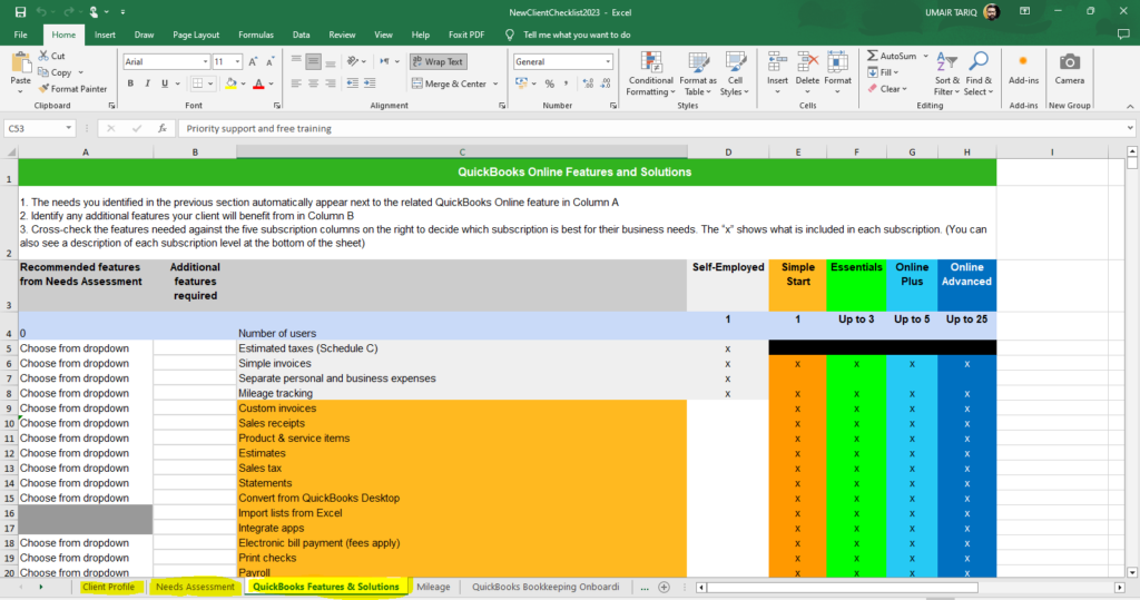 The New Client Checklist is a very helpful resource for getting the information regarding new clients, to collect the correct information from client and to set them up in Quick Books Online and discovering their requirements to best match to a subscription level.
